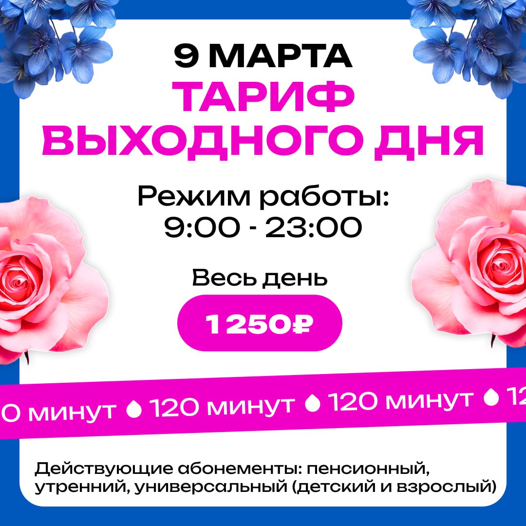 Весь день стандартное посещение (120 минут) за 1 250 рублей.
