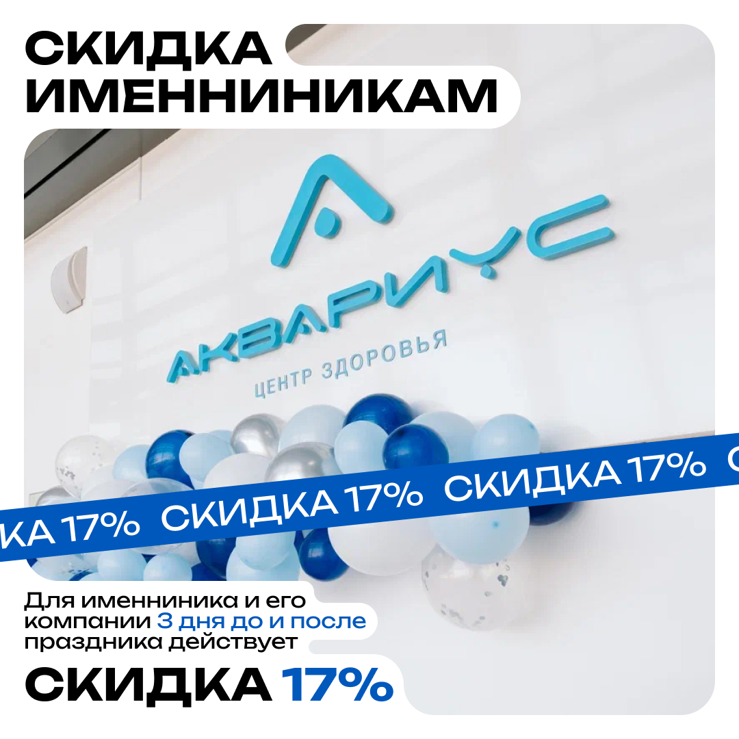 Скидка 10% действует для именинника и его компании на разовые посещения аква-зоны и тренажерного зала, а также на приобретение абонементов только 3 дня до и 3 дня после праздника.